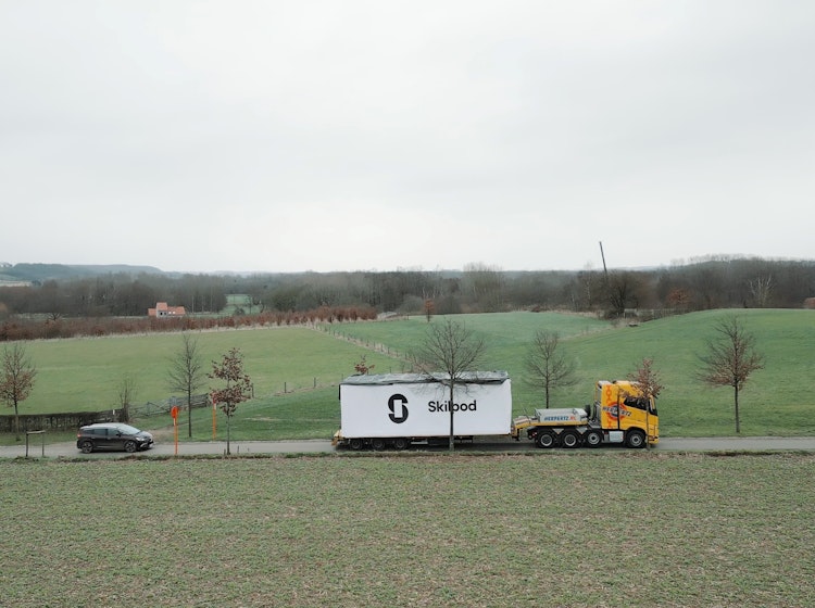 About two weeks before the installation, the groundwork started on the site in Lokeren - At the beginning of September, we brought the houses to the site in Lokeren 4 nights in a row. We were assisted by an exceptional transport team, as the modules of the #110 are two highway lanes wide.